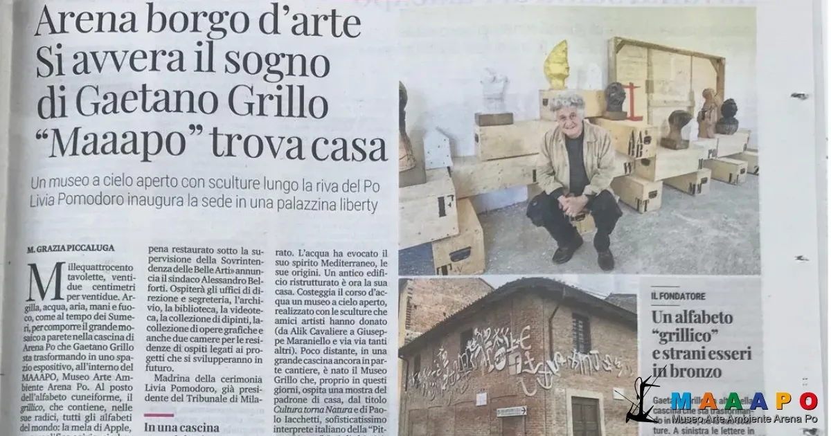 Millequattrocento tavolette, ventidue centimetri per ventidue. Argilla, acqua, aria, mani e fuoco come al tempo dei Sumeri, per comporre il grande mosaico a parete nella cascina di Arena Po che Gaetano Grillo sta trasformando in uno sazio espositivo, all'interno del MAAAPO, Museo Arte Ambiente Arena Po. Al posto dell'alfabeto cuneiforme, il grillico, che contiene, nelle sue radici, tutti gli alfabeti del mondo: la mela di Apple, un geroglifico egizio, simboli, icone, lettere.