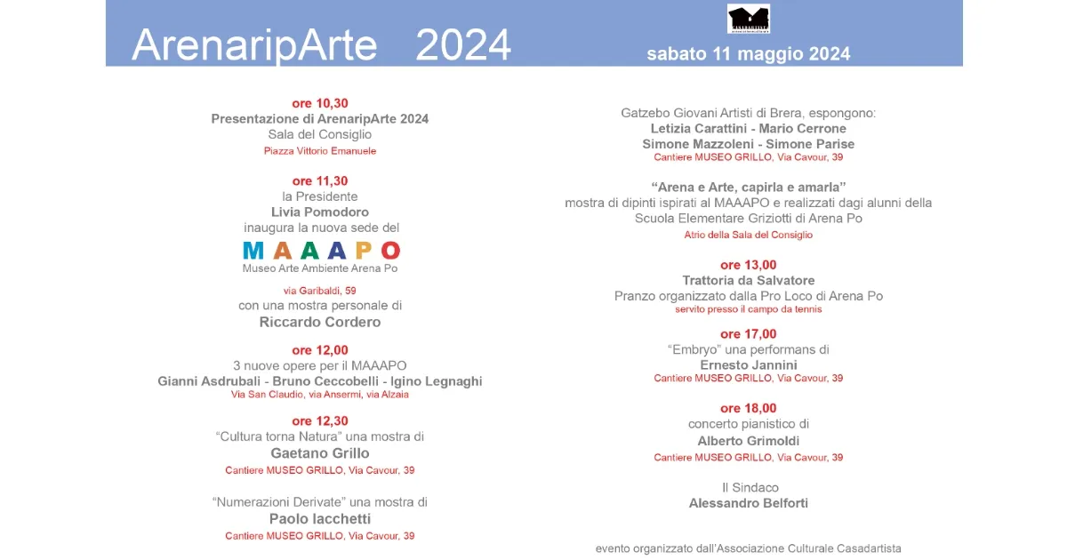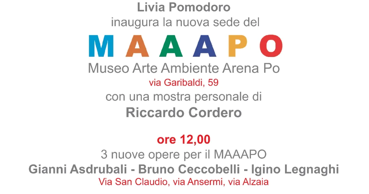 A seguire, alle ore 11.30 si terrà l'inaugurazione della nuova sede del Museo Arte Ambiente Arena Po MAAAPO con la presidente Livia Pomodoro: